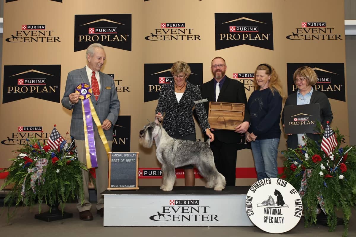 I’m so fortunate to have the support network necessary to breed, raise, train and show top quality Standard Schnauzers. I am grateful to these and other humans — my mentor, Pat White of Halcyon Standard Schnauzers, my son Nick who hand raises Straw Hat puppies right beside me, my daughter Valerie, who helps me navigate social media, and Charlotte Wagner, an amazing behaviorist, puppy evaluator and a great friend.