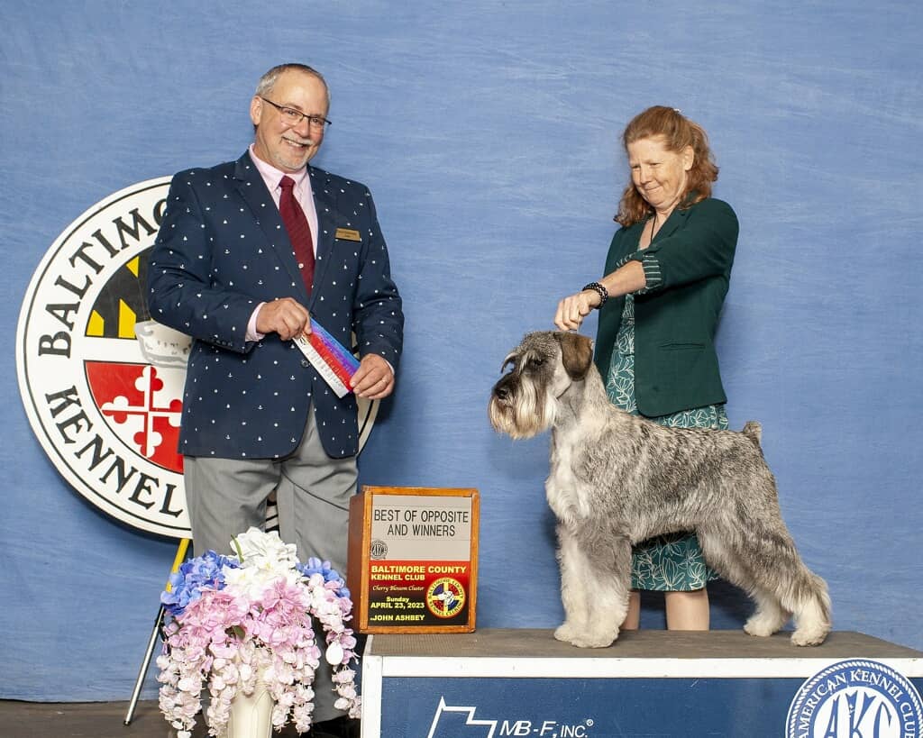 After he spent some time with me “growing up,” Team Roger was formed when Chris White recognized his potential and purchased him from me as a Specials prospect and then almost immediately became a good and valued friend. Chris showed Roger to several Owner Handled group placements before asking Laura King to show him at the Prairieland Specialty in Illinois in Spring of 2023 where he won Best of Breed and Second place in the Working group. It was a real honor to get to show him again myself to Best of Breed at the Knickerbocker Specialty and to Best of Opposite Sex at the Potomac Valley Specialty in the Fall. Needless to say, we were ecstatic when Laura King’s partner Robin Novak steered Roger to Best of Breed at the AKC National Championship in Orlando in December.